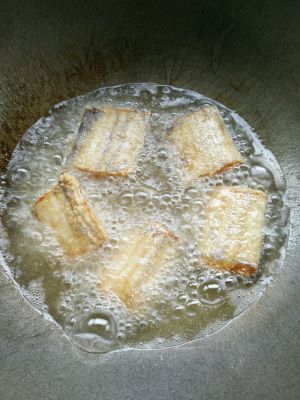 锅内倒入植物油,中到大火把油烧热,可以先放入腌的姜片试油温。放入带鱼段炸至两面金黄。