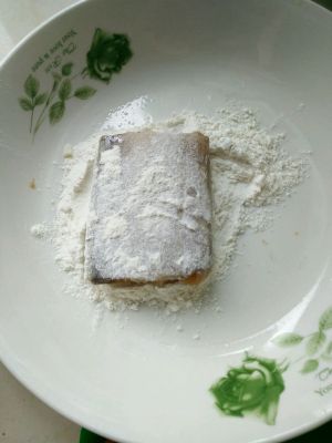取一干盘子或碗,撒入面粉,把腌好的鱼段两面薄薄的沾上面粉。