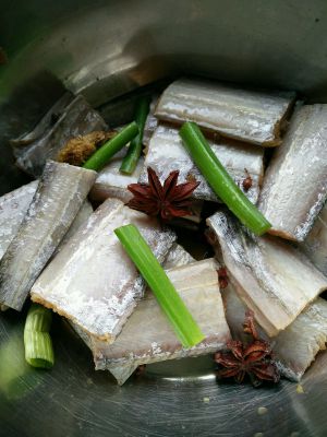 带鱼洗净,剪成段。料酒,酱油少许,八角,花椒,葱段,姜片倒入带鱼中,腌制20分钟。如果直接炸着吃的话调料可多放,腌制时间1小时以上,以便入味。