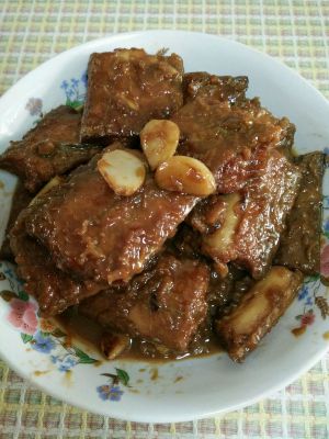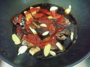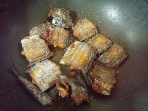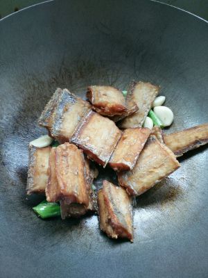 姜片和蒜用油炒香炒干,捞起姜片和蒜,将带鱼铺平在防粘锅里煎香、煎干,这一步一定要做到位,也是这道菜成功与否的关键之一。