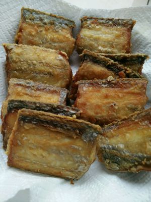 炸好的带鱼。油太多的话可用吸油纸沾去多余的油。