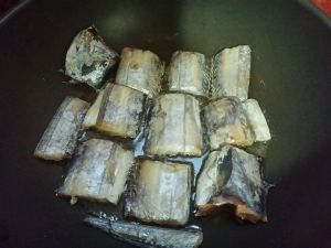 带鱼控干水,锅内加少许油,小火煎带鱼,煎致两面金黄。
