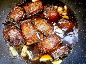 加入料酒,生抽,香醋,白糖。翻炒,加开水,没过带鱼。大火烧开,转中小火慢炖。