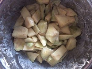 锅中放入适量油,烧至七成熟,火关小些,放入沾好淀粉的茄子,炸的时候记得不断翻动,表面变得金黄色,捞出。