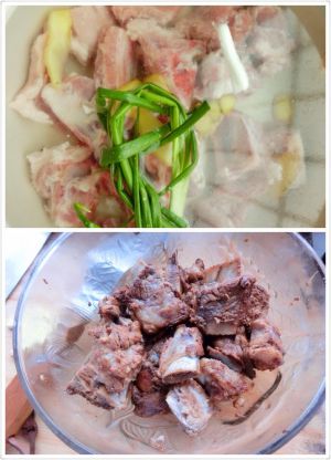 排骨洗净,锅里加水放入排骨、姜、葱水烧开后转小火炖半小时以上,想要排骨颜色更好,可以将炖好的排骨用酱油腌制十分钟左右。(备注:酱油不要放多了,以免做出来的排骨颜色太黑)