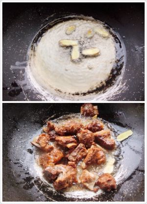 锅中烧油放入姜爆炒再放入腌制好的排骨炒至两面金黄就可以了。