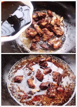 热锅放油,炒香姜蒜,倒入排骨,将其煸炒到两面金黄后,立即放入料酒。
