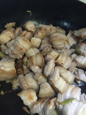 锅里倒一些油,可以比平时炒菜多一点油,油热后放白砂糖炒,不要不舍得放糖!500克的肉怎么也得放五大勺糖(家里吃饭用的普通瓷勺,不是盛汤的大勺子哈!)炒糖时要不停翻动,一是为了上色,二是味道一级棒!等把糖炒至融化变褐色后,立刻把猪肉块放进去,翻炒!直到肉块均匀上色!
