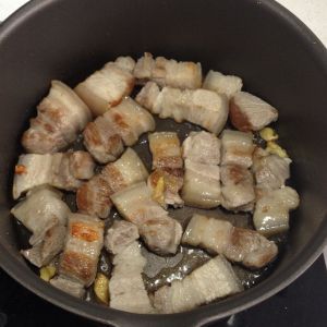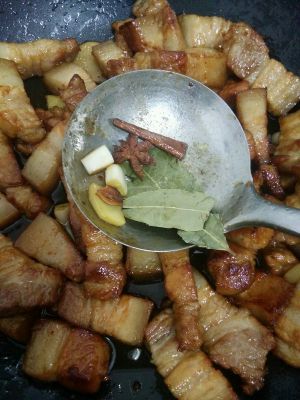 加入大葱段、姜片、八角炒香,再加入五花肉小火煸炒至出油脂