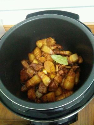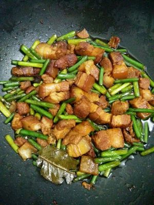 时间到了就好了。 我临时想加点素菜,就用煮肉的油炒了蒜苔,炒好了就加入做好的红烧肉。轻轻翻炒入味就可以出锅了。红烧肉特别软糯,炒的时候一定要注意。