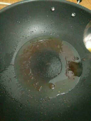 锅内放油和冰糖,小火炒糖色,至冰糖溶化成褐色