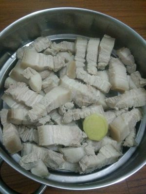 五花肉洗净,飞水去血水,用热水冲洗沥干,平底汤锅放入少量油老姜煸香,放入五花肉慢煎,煎到四面焦黄猪油香溢出,猪肉本身的油也出来了