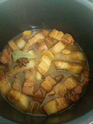 喷少量黄酒后加凉水,一次加足,大火烧开加入冰糖,冰糖要稍多一点,生抽老抽,小火慢炖1个-2个小时