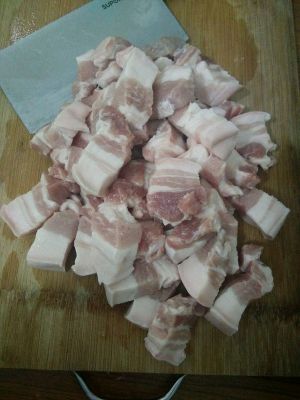 五花肉切块,放入开水烫2-3分钟,捞起洗净备用