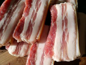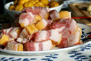 猪五花肉用刀把毛刮干净,然后切条再切成块,块状要稍微大一点,因为会缩水。