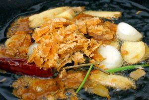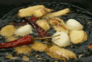 花椒大料凉油下锅,炒出香味,八分油热加入姜片