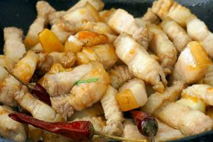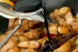 热锅凉油,放入一把冰糖炒化并呈焦糖色;
