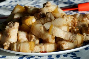 锅中不用放油,倒入五花肉,煸出油脂至表面微焦,盛出五花肉,煸出的油脂可以用来炖菜很好吃,如果不喜欢就倒掉;不要了
