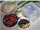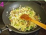 再起锅大火烧热,大火炒河粉,加放步骤3,再放豆芽和葱段,保持大火兜炒,胜盘