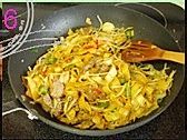 最后倒入事先炒好的配菜,用筷子拌匀,撒上葱花即可; 整个过程要把握好油的用量,太少河粉可能粘连,太多又过于油腻。