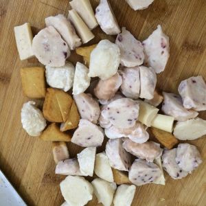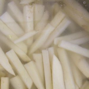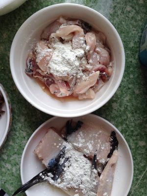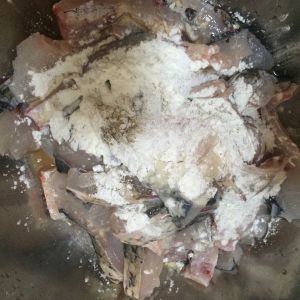 将盐 料酒 淀粉 分别放在鱼肉 鱼骨中味好 待用