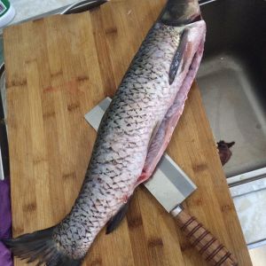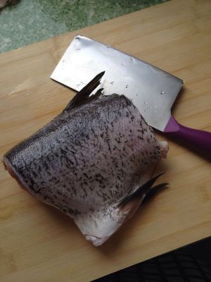 将鱼头和鱼尾剁下,鱼头从中间剁开这样比较入味和好熟