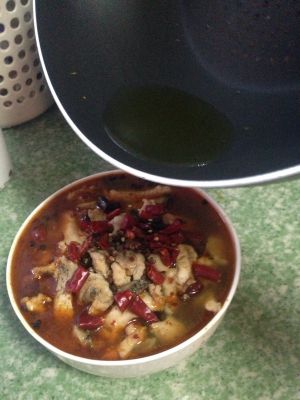 浇入鱼肉中放上干辣椒麻椒备用 现在看起来就有食欲了
