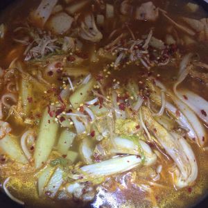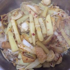淋入油放入准备好的备料炒出香味添水煮开 放盐和味精