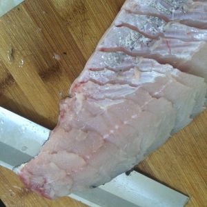 鱼肉45度切两刀,第一刀不要切断,第二刀切断