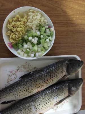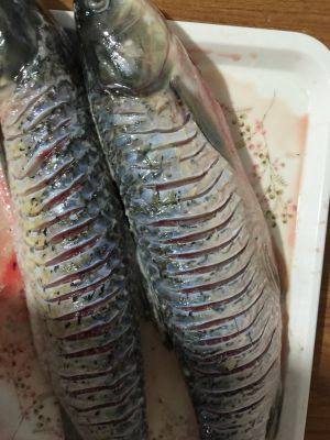 鱼清理干净后在鱼身上划出一道道口子,用盐和料酒腌5—10分钟左右