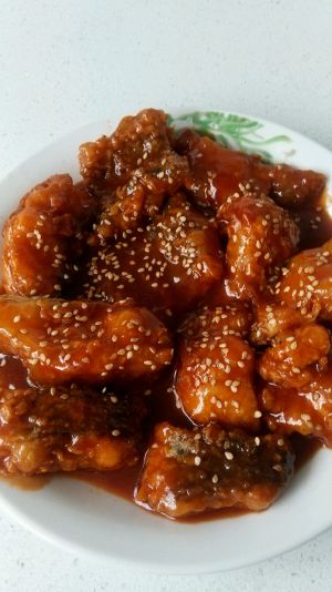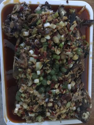 炸过鱼的油,放入花椒小火煎出香味,放入少量郫县豆瓣。依次放入姜粒,蒜粒,生抽,醋(按自己喜欢可稍多放),清水(少量),糖,鸡精,大葱…炒至汤汁变浓稠时关火。趁热把汤汁浇到炸好的鱼身上…OK!完成了!