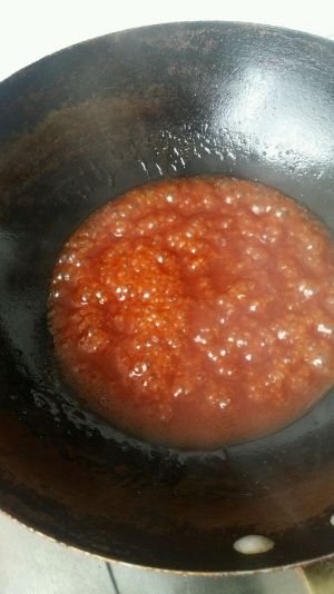 加入料酒、番茄沙司、生抽、白糖和适量清水烧开煮至汤汁粘稠;