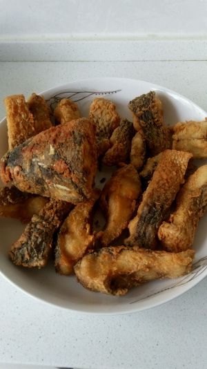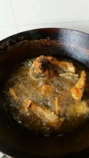 鱼头炸制时,最好遮挡下,因鱼头内有水分,炸制金黄,取出控油,锅内继续加热,下鱼块复炸,快速捞出控油。