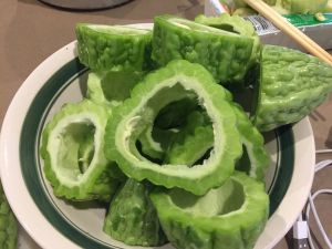 苦瓜切段,六七公分宽度,泡盐水,去苦味,或者放入开水中汆一下