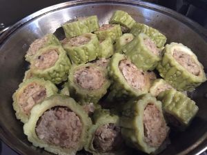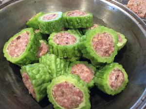 五花肉加入鸡蛋和少许淀粉、葱、姜、盐等调味。将肉塞进苦瓜,隔水蒸15—20分钟。