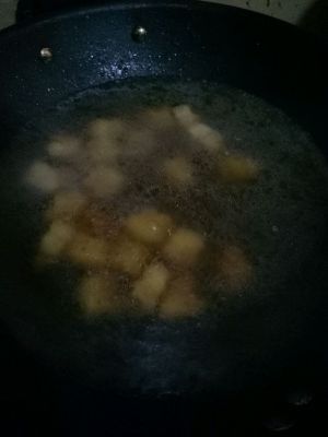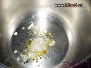 起油锅,放入适量白糖,等到糖变成焦茶色起大泡;