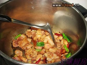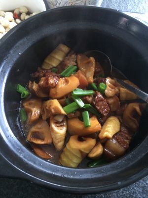放入制作好的红烧肉中,用砂锅慢炖,加入适量味精,葱