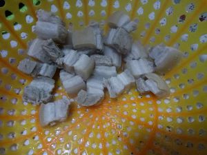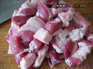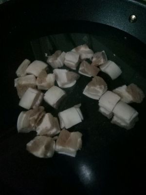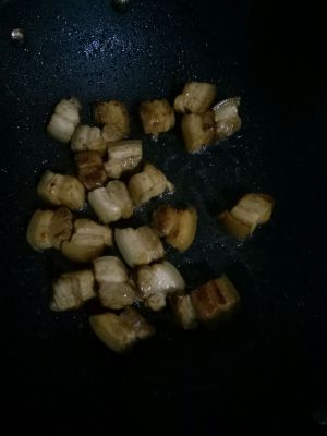 将过水后的肉切成小块,放入锅内煸炒(锅内不放油),把肉炒的有紧凑感,