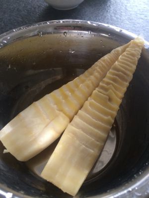 春笋先剥皮,加入开水锅中处理,放入盆中备用。