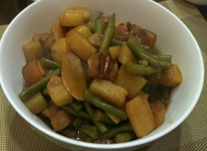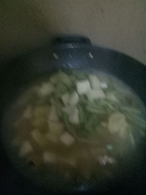 加入土豆豆角和蒜姜等,加盐调味,加少量老抽上色。先用大火,水开后转小火十五分钟,再用大火收汁。照片糊了
