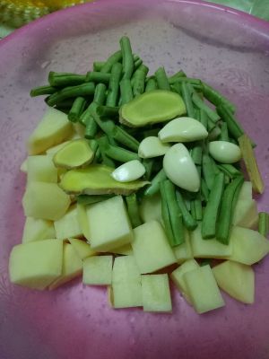 豆角切段,再长一点儿更好。土豆切块,整块的蒜,姜切片