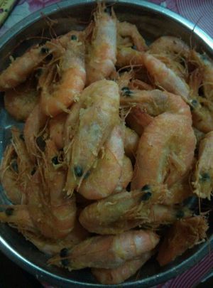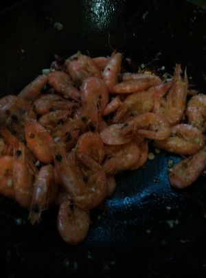 炒锅烧热倒油,油热后把虾放到锅里翻炒,看到虾的颜色变红了,就先盛出来。