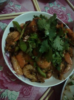 把炸好的虾放入锅里翻炒,放点生抽,盐,鸡精,少许白糖,料酒,香油,孜然粉,后面觉得花椒不够麻的话可以在起锅前在放点花椒油。