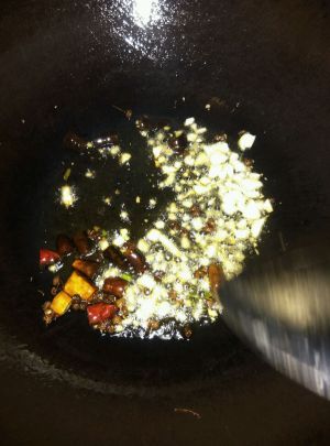 锅里面放油烧热放入干辣椒,干花椒,姜蒜粒炒香。