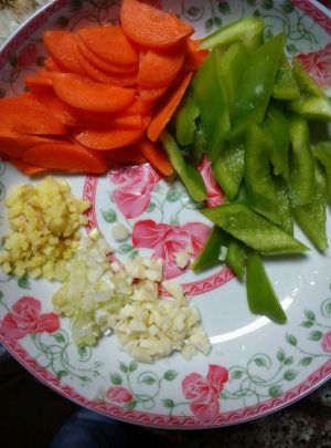 准备青椒,红椒切块。我这里没有红椒就用胡萝卜代替了,准备姜蒜粒。再加点芹菜更好,我这次没有所以没加。