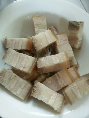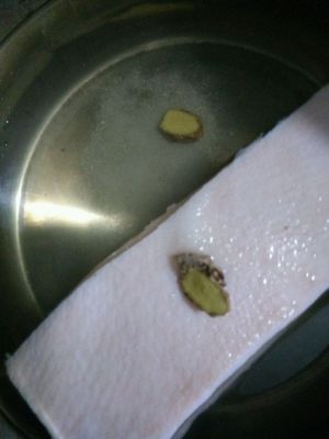五花肉洗干净,凉水下锅,放入姜片和料酒煮至断生(即用筷子插进去没有血水冒出来)