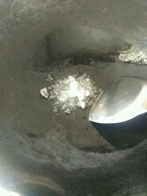 锅里倒上油,放上冰糖,小火慢炒,炒出糖色。
