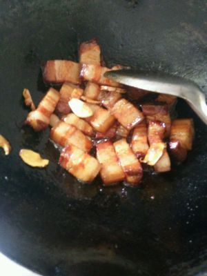 赶紧把切好的五花肉倒下去翻动,使其均匀的裹上糖色,加上姜片和蒜片一起煸炒。