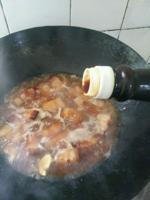 冰糖在锅里融化,倒入过好水的五花肉丁,炒糖色