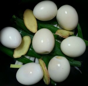 把煮好的鸡蛋剥去蛋皮,摆在葱丝上面。